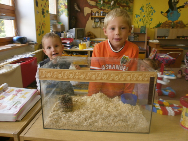 Když jsme ježečka našli vážil pouze 176 g.Bylo nám ho líto,a tak jsme se rozhodli,že ho zkusíme vykrmit a pomoct mu tak přežít.Děti si ho hned oblíbily a pojmenovaly ho Lojzík.Lojzík měl opravdu luxusní péči,co se týče stravy,obydlí a také zdraví.Rodiče i děti mu nosili různé dobrůtky a tak ježeček rostl a rostl,až nám za měsíc a půl tak vyrostl,že vážil téměř 800 g.Děti měly po celou dobu názornou ukázku jak ježek vypadá,jak se chová,jak roste.....V současné době přečkává zimu ve vypolstrované krabici u nás na školní zahrádce.