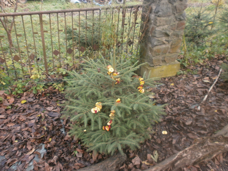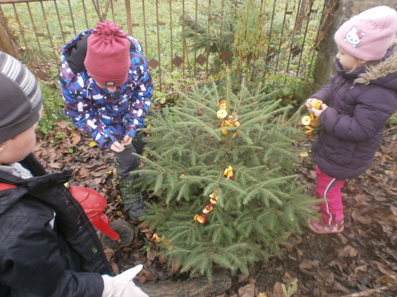 Děti  přišly na výborný nápad,že nazdobí stromeček na zahrádce pro ptáčky.Tak se daly do práce....